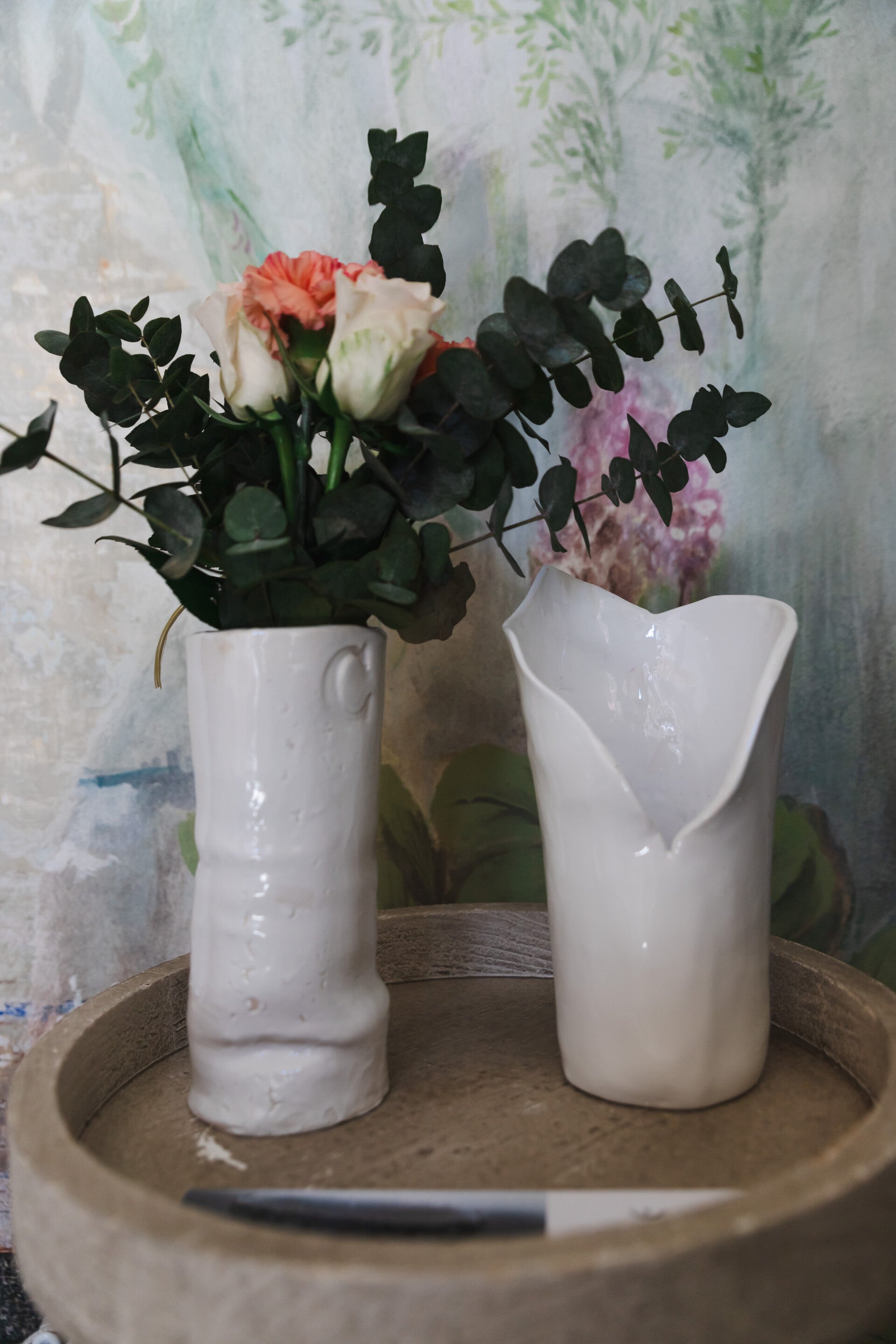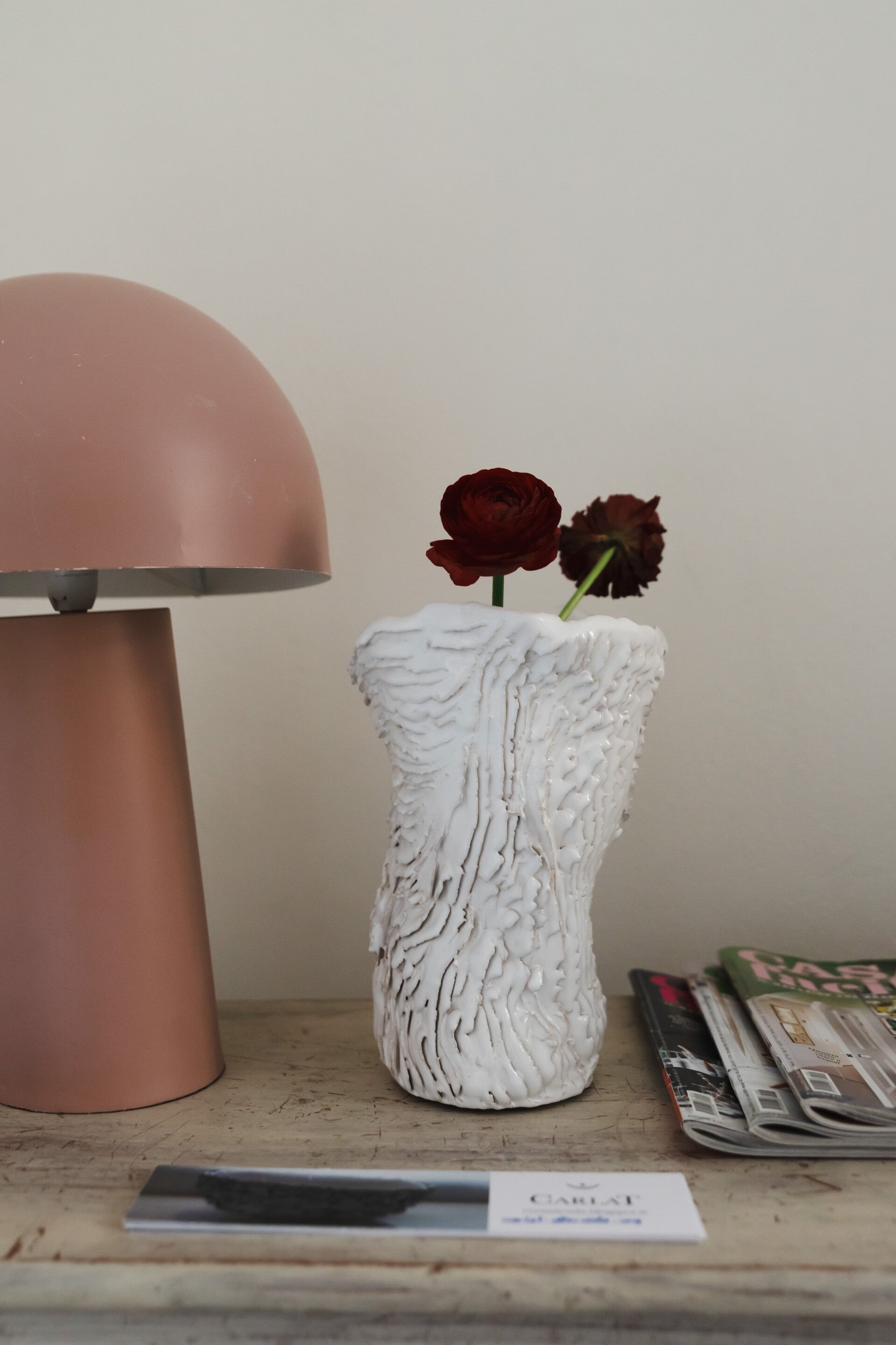 Un’altra tecnica applicata da Carla è la lavorazione della paper-clay in cui l’artigiana realizza molteplici effetti tattici grazie alla contaminazione tridimensionale di vari materiali (carta, stoffe) che plasmano le superfici.