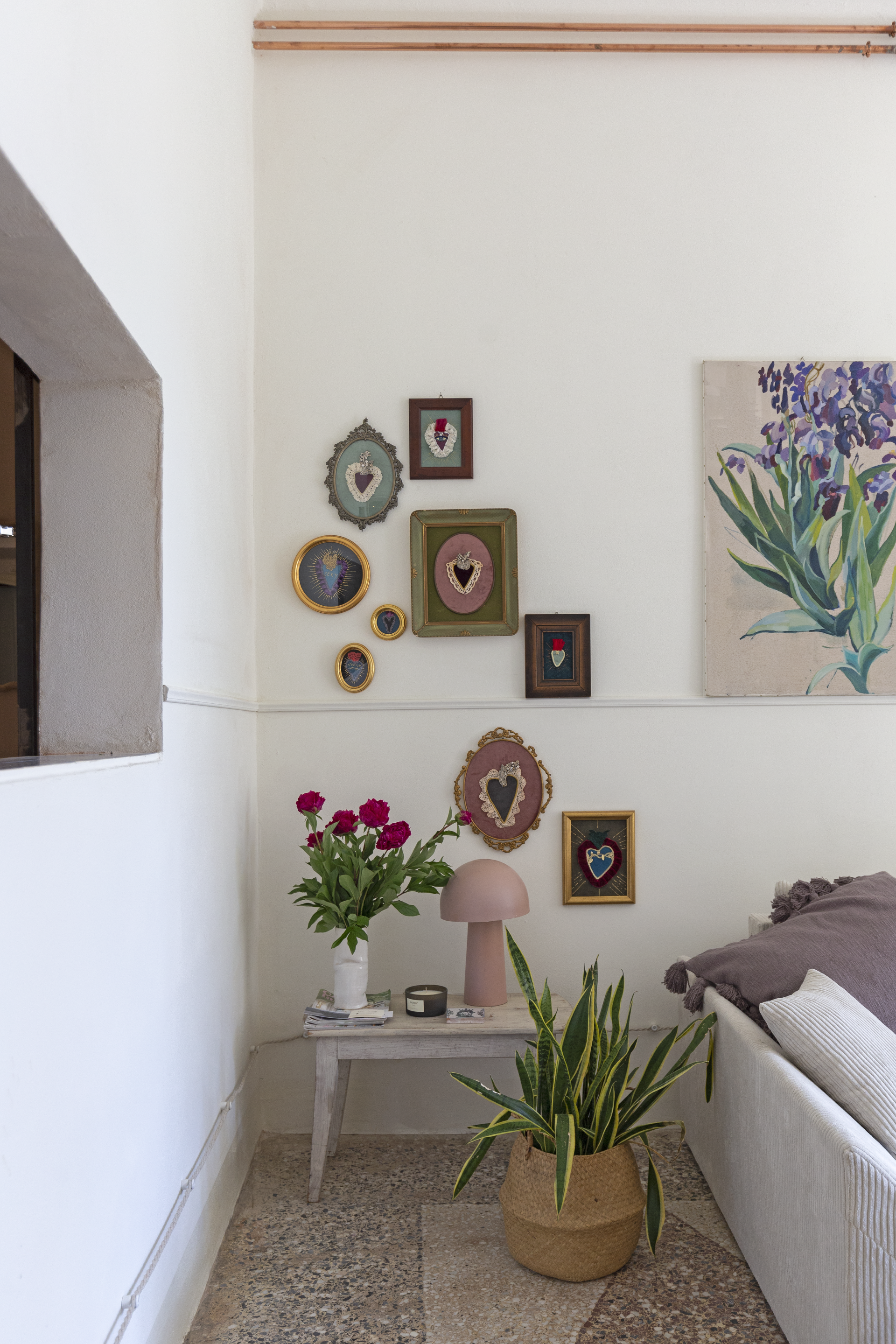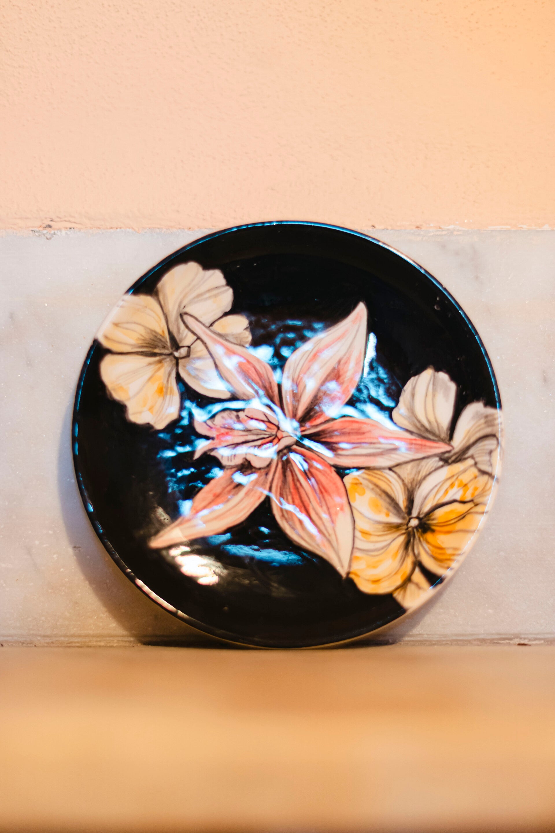 “Gelsomina decor” nasce in questo modo, pensando ai fiori come elementi parlanti, dipingendoli con il suo stile che esprime calore e precisione, accostando i colori in palette a tratti essenziali e scuri, a dimostrazione della sua capacità di saper cogliere i contrasti.