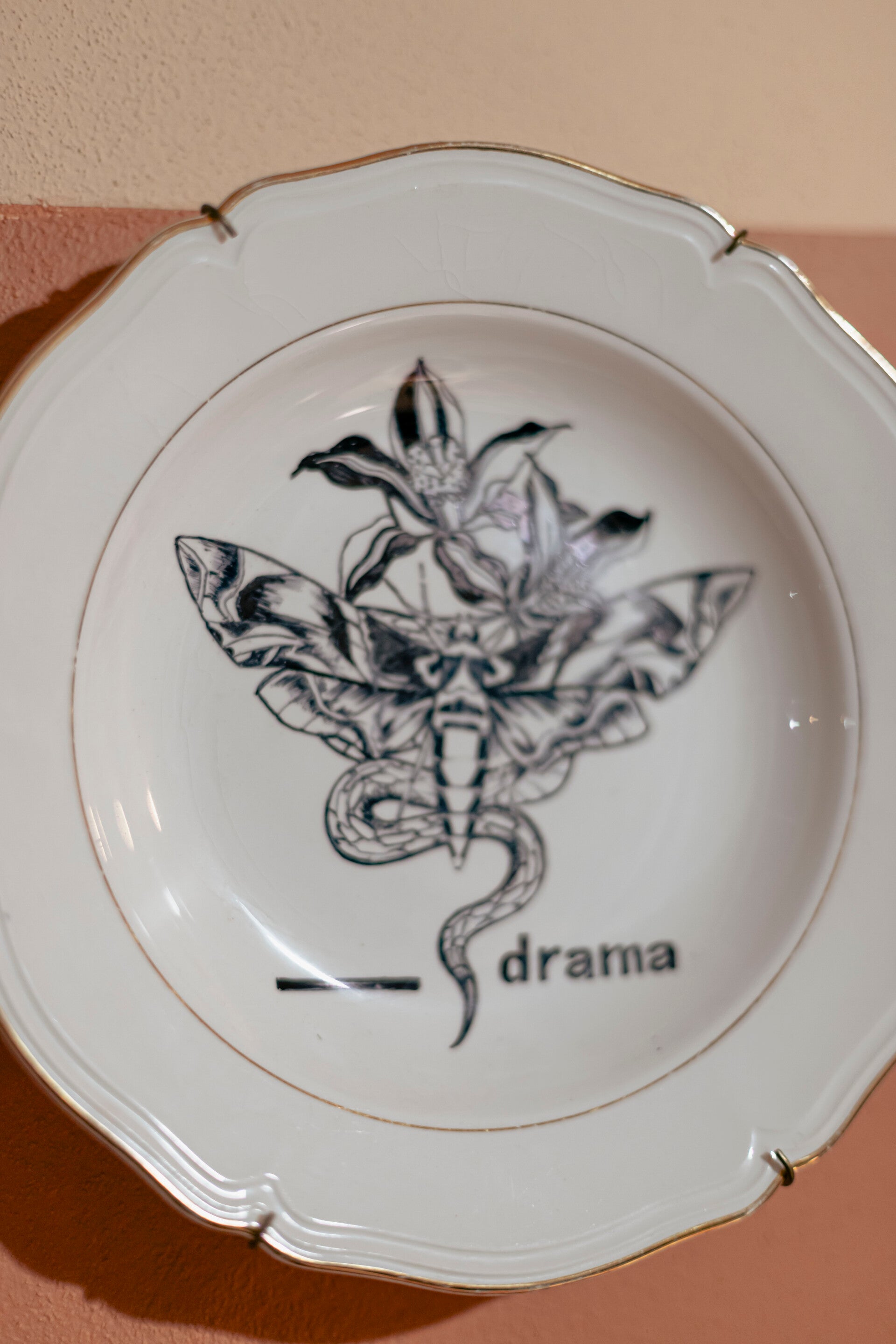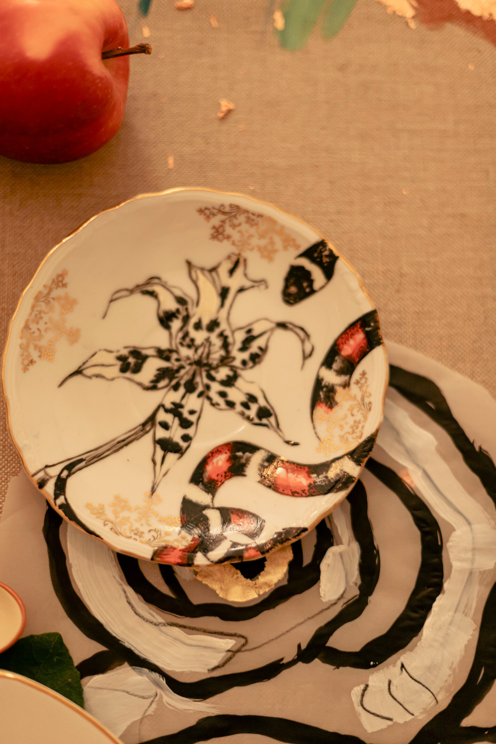 Gli elementi naturali sono i protagonisti delle sue creazioni, realizzate su piatti o teiere, dove la potenza e la grazia espressiva del fiore è accompagnato da un cardellino in volo, una carpa sinuosa, una falena notturna o da un’agile serpente, permettendo a tutti di poter accedere in quel suo giardino immaginario in cui perdersi felicemente.